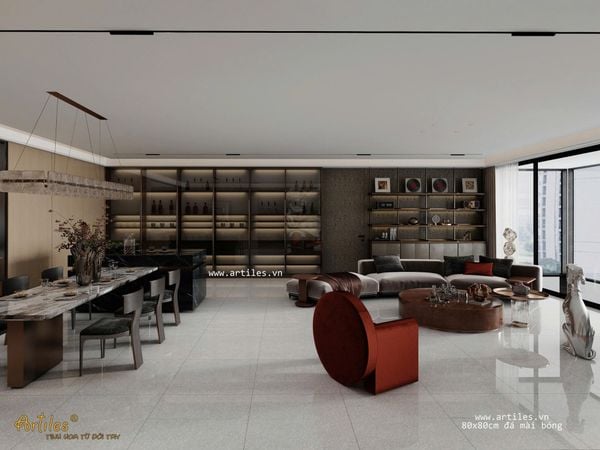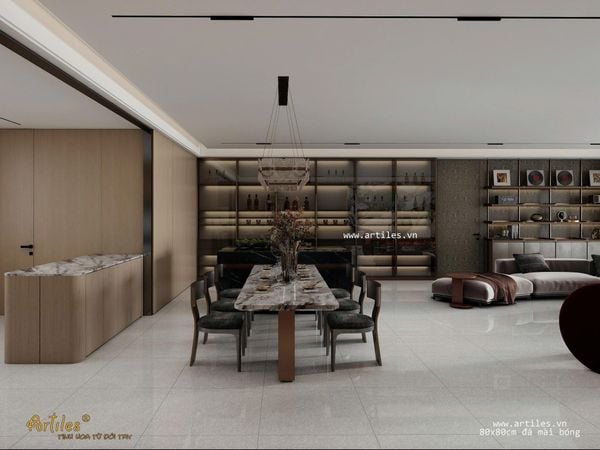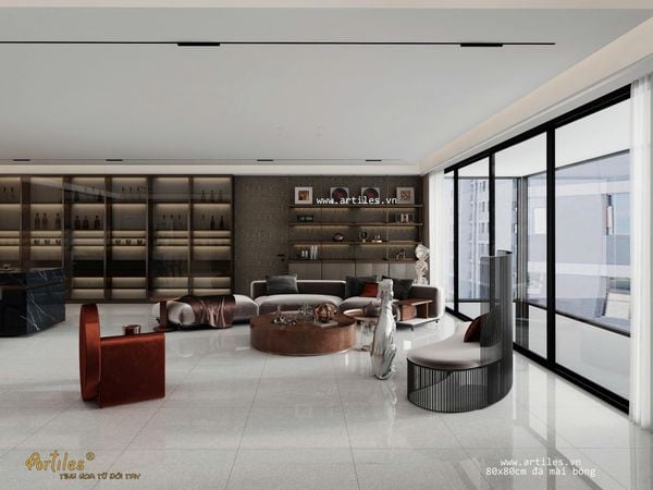 Gạch bóng kiếng vân đá mài 80x80cm với bề mặt gạch bóng vi tinh - độ bóng tựa gương tạo hiệu ứng khiến cho tổng thể không gian trở nên rộng rãi hơn gấp nhiều lần. Bộ sản phẩm với nhiều hạt đá màu sắc khác nhau phù hợp nhiều không gian khác nhau.